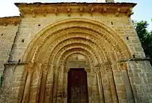 Las seis arquivoltas reposan alternativamente sobre una hermosa imposta con complicada decoración en tres columnas acodilladas a cada lado entre pilastras; hay un tímpano vacío que está reclamando el Crismón que debió alojar en su día, hoy perdido.