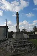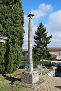 - La cruz en la esquina noroeste se eleva sobre cuatro escalones octogonales en el lado este y cinco en el lado opuesto. La base y el pedestal son cuadrados. El fuste es cuadrado, sus ángulos están flanqueados por pilastras prismáticas. En la parte inferior del barril la fecha : lmccccc (1500). La cruz en sí es más moderna. Vemos en la parte superior, el sol, la luna y la inscripción : LHOSTÉ FECIT 1780 . Es el mismo cantero quien, en 1782, realizó la pila pedicular que se encuentra en el interior de la iglesia.