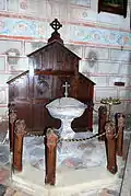 - La pila bautismal de mármol está cerca del muro norte, debajo de la vidriera que representa a San Gerardo.