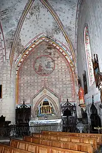 El interior de la iglesia está completamente cubierto de murales: en las propias paredes; sobre las bóvedas, sus nervios y sus llaves; sobre las columnas con sus capiteles y el incendio de las ventanas. Todas las pinturas fueron rehechas en 1866, a excepción de la crucifixión del siglo XVI, recientemente descubierto y restaurado en 1995, que adorna el muro occidental. La restauración, realizada con prisas (cuatro meses para el conjunto), con más buena voluntad que fidelidad a los originales, fue radical. Estandarizó el color del revestimiento y la simulación del aparato, demasiado diversificada para el gusto de los restauradores.[6]