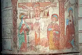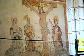- En el muro occidental, una crucifixión renacentista en su estado original, tras la restauración de 1995.