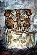 - La cruz en la esquina suroeste se eleva sobre dos escalones pentagonales al oeste y tres al este. Está menos ricamente decorado que el del noroeste. El eje está truncado y la cruz ausente.