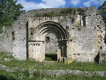Reposa en una imposta decorada con motivos vegetales, que ornan también el capitel derecho. En el capitel izquierdo hay dos animales fantásticos y en el tímpano una representación del Salvador. Se conservan cinco canecillos de fines del siglo XII y otro de comienzos del siglo XIII, todos muy deteriorados. Están decorados con animales, músicos y figuras humanas. En la ampliación oeste del templo, llevada a cabo en el siglo XIII, hay otra portada con dos arquivoltas apuntadas bajo guardapolvo.