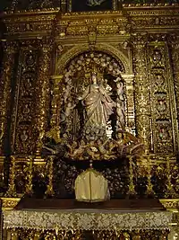El retablo data de 1708 y es obra del maestro tallista Bento da Fonseca de Azevedo.[42] El diseño gira en torno a una representación central del “ Calvario ” rodeado de un “encaje” de ángeles en madera tapizada sobre un fondo de bajorrelieve realizado en yeso pintado al temple y dorado que probablemente representa a Jerusalén. Una hermosa escultura del siglo XVII de la Piedad en madera tapizada completa la tribuna. [43] La parte central del retablo está flanqueada por dos pares de columnas retorcidas pseudo-salomónicas con paneles decorados en el medio.