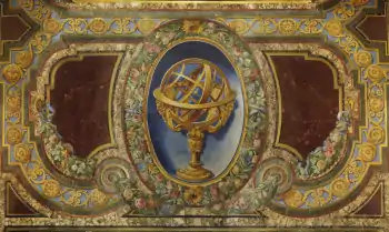 El techo pintado de la nave [8] es un trampantojo [9] diseñado para dar la ilusión de una bóveda de cañón sostenida por cuatro grandes arcos cubiertos de volutas y otros elementos decorativos. Entre los arcos hay balcones cuadrados pintados y "encima" de estos balcones hay tres enormes cúpulas que se elevan sobre anillos de arcos abiertos y columnas. La mayor parte fue pintada entre 1584 y 1586 por Francisco Venegas (fl. 1578-1590), pintor real del rey Felipe II. Los jesuitas añadieron el gran medallón central (La Glorificación de la Cruz), así como 8 grandes pinturas y 12 paneles monocromos que representan acontecimientos bíblicos. El techo cerca de la parte delantera de la iglesia fue dañado en el terremoto de 1755 y fue reconstruido y repintado. En 2001 se restauró todo el techo y se limpió o reparó la pintura.[10]