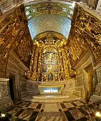 El revestimiento de mármol de brecha y el altar presentan también motivos botánicos, zoológicos, antropomórficos, geométricos y alegóricos. Fue ejecutado por los maestros canteros Manuel Antunes y João Teixeira y terminado en 1690.[24] Los nichos laterales albergan relicarios de la colección de D. João de Borja. La escultura que se encuentra en el interior de la vitrina bajo el altar es el "Cristo en la Muerte" y data del siglo XVIII.[25]
