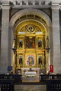 La composición del retablo, de largas proporciones y austeridad decorativa, incluye conjuntos de columnas corintias pareadas montadas en dos niveles.[14] El tercio inferior de cada columna está decorado con guirnaldas de acanto, volutas y objetos colgantes. El pináculo semicircular incorpora una pintura en el redondel, al temple sobre madera, que representa a Cristo, Salvador del Mundo.[15] El retablo es uno de los más importantes de la tradición jesuita: el fundador de la Compañía y sus mayores santos - Ignacio de Loyola, Francisco Javier, Luis Gonzaga y Francisco de Borja - están representados en los cuatro nichos por estatuas, encargadas en 1630, que recientemente se han atribuido al escultor portugués Manuel Pereira (1604-1667).[16] El nicho central de la parte inferior del retablo alberga una estatua del siglo XVII de la Virgen con el Niño en madera tapizada. Delante se encuentran las estatuas de madera plateada de los cuatro evangelistas.[17] En el nivel superior hay una hornacina para la exposición del Santísimo Sacramento - el "trono" (una invención portuguesa característica) suele estar cubierto por una gran pintura al óleo de una escena del Nuevo Testamento que cambia según la estación religiosa.[18] La práctica de cambiar la escenografía del Altar Mayor fue una innovación jesuita. El trono de San Roque (normalmente no visible para el público) fue uno de los primeros permanentes que se crearon en Portugal. Tiene seis columnas corintias y cuatro arcos, elementos geométricos redondos y dos grandes paneles laterales tallados y dorados con árboles simbólicos en relieve. El conjunto forma una especie de pirámide en varios niveles.