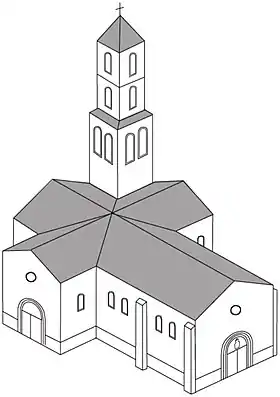 ![]() Recreación hipotética de la iglesia para principios del siglo XIX, basado en un dibujo de De Retz en 1800. | ||