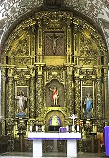 El retablo del altar mayor fue tallado en madera en 1702 y dorado en 1718, es obra de la escuela de José de Churriguera (1665-1725), que destaca por su estilo barroco, recargado en ornamentos. Seis columnas salomónicas recubiertas por serpenteante decoración vegetal realzan la belleza y majestuosidad de la obra.