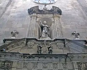 ![]() Frontón y hornacina de la fachada, con la imagen del santo titular | ||