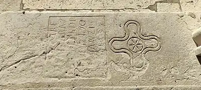 Dentro del conjunto, a pocos metros de distancia de la cara norte de la torre, se identifican tres estelas discoidales decoradas por ambas caras respectivamente.
