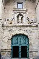 Esta es monumental dentro de su sobriedad. La parte superior consiste en una torre-espadaña erigida en 1901 en estilo neo-barroco siguiendo un diseño de José María Basterra de 1894; sustituyó a una anterior de estilo clasicista. La espadaña se estructura en tres campaniles, pináculos y remate en forma de templete clásico. La parte inferior pertenece a la fábrica original del templo y toda ella es dominada por un gran arco apuntado rebajado que cobija a modo de pórtico una portada interior. Esta arranca con un arco de ingreso de tipo carpanel; sobre él, una hornacina flanqueada por pilastras, aletones de roleos y flameros, que acoge una imagen del santo titular del templo de estilo romanista; rematando el conjunto, una ventana adintelada hecha con dovelas y un sencillo frontón de cornisa curva.