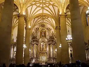 Construida en sillería y mampostería, se trata de una iglesia de planta de salón, típica de la arquitectura religiosa del Renacimiento español y muy particularmente del vasco. La planta se articula en tres naves, la central más ancha que las laterales, de cinco tramos cada una, dando lugar a 15 tramos en total, todos de la misma altura. El alzado consiste en ocho altas columnas de fuste cilíndrico y liso, de tipo toscano, y rematadas por capiteles de orden dórico. Sobre ellas descansan los arcos generatrices, nervios y terceletes (unidos por combados, dando lugar a nueve claves por tramo) de las bóvedas de crucería, obra de Martín Ibañez de Zalbidea, que presentan el mismo dibujo en todos los tramos, de fortma uniforme y a la manera gótica de cuatro puntas con enriquecimiento de nervios en torno al polo y con nueve claves en total. Esta estructura fue levantándose con lentitud desde finales del siglo XVI hasta mediados del XVII.