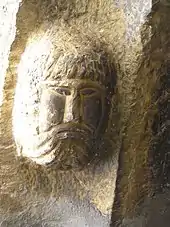 La puerta es pequeña con arco de medio punto realizada con dovelas de piedra calcárea roja. En el canto tiene unos pequeños relieves esculpidos con cabezas y bolas. Las cabezas tienen las facciones parecidas a las de Adán y Eva de la iglesia de Santa María de All. En la madera de la puerta quedan restos de hierros forjados con espirales formando dibujos, propias del estilo románico.