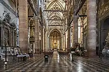 La iglesia tiene planta longitudinal con tres naves con bóveda de crucería, divididas entre ellas por hileras de columnas de mármol blanco y rojo con capiteles góticos. El pavimento es el original de 1462. Está formado por mármol de tres colores (blanco, negro y rojo). El suelo, las columnas y la ornamentación de las bóvedas tienen una grata uniformidad cromática. Después del transepto se encuentran el ábside y cuatro capillas laterales. Las dos columnas que se encuentran detrás del altar mayor llevan el escudo de armas de los Castelbarco. Esta familia, de Avio (Trentino), fue una de las más generosas en la construcción de la iglesia, razón por la cual se le construyó el sarcófago al lado izquierdo de la fachada. Una característica casi única de la iglesia son las dos pilas al lado de las columnas cercanas a la entrada. De hecho se apoyan sobre dos jorobados bigotudos, el primer con las manos apoyadas sobre las rodillas, el segundo con una mano puesta sobre la cabeza con muestra de preocupación. La atribución de las obras no está segura, el primer jorobado se atribuye a Gabriele Caliari, el segundo a Alessandrino Rossi.