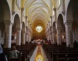 Fue dedicada en el 1347[8] a Santa Catalina de Alejandría. Fue construida en un estilo neogótico más moderno, y desde entonces ha sido modernizada varias veces acuerdo con las tendencias litúrgicas aprobadas después del Concilio Vaticano II (Concilium Oecumenicum Vaticanum Secundum). Esta es la iglesia donde el patriarca latino de Jerusalén celebra la misa de medianoche en la víspera de Navidad.