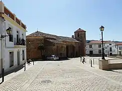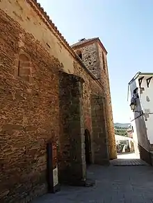 La construcción está realizada a base de mampostería de piedra local (pizarra), con refuerzos de cantería de granito en esquinas, contrafuertes y vanos. El ladrillo está presente en la rosca de algunos arcos y el remate en la torre campanario. La cubierta está acabada en teja cerámica curva de tipo árabe. En el exterior, de apariencia modesta, la fábrica de los muros aparece visible, al haber perdido el revoco original de mortero de cal. Las ventanas son escasas y sencillas. Se accede al interior por medio de tres portadas sencillas de cantería de granito, una a cada lado, con arco de medio punto, sobre impostas molduradas. Y la tercera, a los pies, también de medio punto, está cegada. La continuidad del muro se rompe con contrafuertes de cantería que corresponden al refuerzo de los arcos fajones interiores. El campanario es de un solo cuerpo, recrecido, de dieciséis metros de altura; en él se aprecian vanos cegados de una primera fase constructiva y dos campaneros de medio punto; el remate es muy simple, con forma piramidal achaparrada.[1]