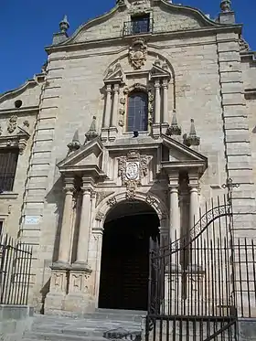 La fachada principal es de piedra arenisca, en su centro podemos ver el escudo de la orden Trinitaria y está decorada con arcos de medio punto. Su interior consta de tres naves; la nave central está coronada por una bóveda de cañón decorada con cabezas humanas y pilares con pilastras corintias. La cúpula está situada en la parte del crucero.