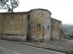 Al construirse en la Edad Media debió tener una sola nave; actualmente cuenta con tres, pues se amplió en época barroca. De la época románica solo queda lo que es la cabecera: el ábside y el presbiterio. La parte exterior del ábside está dividida verticalmente en tres calles, gracias a dos contrafuertes; y también habría columnas por encima de los contrafuertes, pero solo se conserva la basa. En cada calle hay una ventana de medio punto, sostenida por columnas con capiteles de motivos vegetales, en los que se apoya una arquivolta de "baquetón", esto es, una moldura redonda y grande. La decoración de estos ventanales proporciona una datación avanzada a la iglesia, predominando las "roscas" vegetales. Una imposta recorre a media altura el ábside.