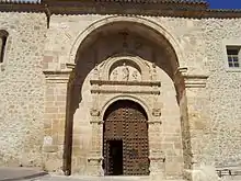 La portada principal se halla compuesta por arco de medio punto enmarcado por pilastras profusamente labradas, que soportan un entablamento formado por friso y frontón semicircular; en el interior de este último hay una gran hornacina con la imagen en bulto redondo de una Virgen María y un Niño Jesús con relieves de ángeles a ambos lados. Toda la decoración es característica del plateresco. Remata el conjunto en su parte central una cruz y dos medallones que representan a san Pedro y san Pablo. A la izquierda de la iglesia se construyó un garaje para el sacerdote (que se adosaría por la izquierda a su vivienda), solución que distorsiona la contemplación de esta portada. La portada opuesta presenta gran sencillez de líneas. Es de arco de medio punto moldurado, enmarcado por pilastras que soportan un entablamento compuesto de friso con metopas y triglifos y frontón triangular que cobija una hornacina vacía; está protegida por un tejaroz que descansa sobre dos contrafuertes prismáticos sitos a ambos lados de la portada. El patrimonio mueble de la iglesia es abundante y de calidad.[1]