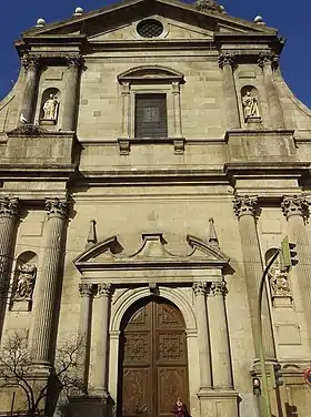Su fachada de granito presenta cuatro esculturas talladas por Manuel Pereira en 1624: San Pedro, San Pablo, San Ignacio de Loyola y San Francisco Javier. La vinculación con los Mendoza se atestigua por la presencia de su escudo heráldico.