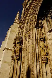 La fachada está flanqueada por dos pináculos que poseen dos series de imágenes de santos, cubiertas en repisas apoyadas en repisas.