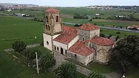 De la época románica conserva el ábside, el presbiterio, el pseudo-crucero y la linterna. Su planta es original, pues a la sola nave con ábside semicircular se le añaden un falso crucero o pseudo-crucero cubierto por cúpula abovedada en forma de rincón de claustro; y, a los lados, aparecen "absidiolos", es decir, ábsides más pequeños que el principal. De esta manera, acaba teniendo en la cabecera, una estructura trebolada que, según Campuzano y Zamanillo, "habría que poner en relación con la arquitectura mozárabe".