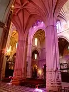 El interior contempla un gran planta de salón formada por tres naves y capillas laterales. Destacan las bóveda de nervadura de las naves, de carácter estrellado en la cabecera y sexpartito en los pies del templo. La estructura de las nervaduras del cimborrio en la nave central, presenta mayor complejidad y se encuentra decorada con medallones que representan ángeles en las claves de los arcos. Sus columnas son el resultado de la unión del conjunto de nervaduras.