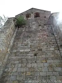 En los muros pueden verse cuatro tramos separados por contrafuertes y cabecero rectangular. El testero, que dispone de cuerpo de campanas superior, y los dos últimos tramos son de igual anchura. El gótico primitivo se manifiesta en los arcos apuntados, los capiteles y las altas basas. La fábrica es de sillería regular, con contrafuertes exteriores. Adosado al último tramo se encuentra el cuerpo de escaleras, de forma poligonal, que permite acceder a la entrecubierta.
