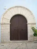 La fachada es simple, desnuda, y sólo destaca la puerta con arco de medio punto donde las dovelas están rodeadas por la imposta y por una moldura o alfiz circular.