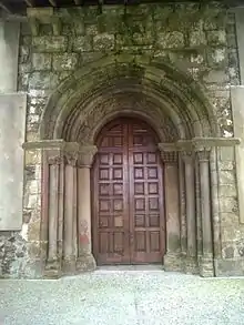 El templo es uno de los escasos ejemplos del románico asturiano con tres portadas. La Norte está tapiada actualmente, mientras que la Sur presenta una arquería algo apuntada de doble arquivolta que apoya sobre impostas con decoración geométrica, columnas y capiteles.La occidental, por su parte, se sitúa sobre un cuerpo saliente del edificio. Presenta abocinamiento y tiene tres arquivoltas decoradas que apoyan sobre columnas con capiteles decorados. Uno de los de la jamba izquierda tiene figuración humana.