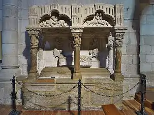 Destaca además el sepulcro, que por su idiosincrasia pertenece a los últimos compases del románico y que popularmente se asigna a un caballero templario. Su creador es anónimo, aunque posee elementos de corte orientalizante. En cualquier caso, se trata de una dama que yace junto a relieves de animales y seres mitológicos. La talla está tratada magníficamente en cuanto a las telas y los marfiles representados, siendo considerada una pieza de importancia capital. La capilla del interior se dedica Juan de Acuña y Portugal, por donación hecha de su esposa Marina Enriques tras su muerte, una inscripción de caracteres góticos menciona la donación.