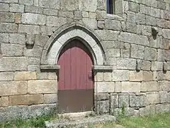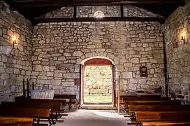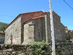 La cabecera es de cantería, con tres ábsides y exterior rectangular, sobresaliendo el ábside central. Cada uno de los ábsides tiene una ventana estrecha y alargada, acabadas en arco de herradura. Los ábsides tienen planta semicircular prolongada y bóvedas de ladrillo. Los altares del norte y central están soportados por aras romanas, con inscripción precristiana la del altar central. En la bóveda del ábside central hay una imagen de Jesucristo crucificado y restos de un fresco policromado.