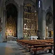 Ático: San Jerónimo, Calvario, Santiago. San Jerónimo lleva vestimentas de cardenal y tiene un león rampante a sus pies. A Santiago se le muestra como un peregrino. El Calvario remata la obra y contiene el crucifijo, la Virgen, María Magdalena y María Salomé.