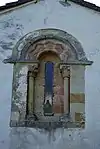 La ventana del testero está ornamentada con una arquivolta en zig-zag y un guardapolvo de medios círculos. A los lados hay dos columnas con capiteles de grandes hojas.