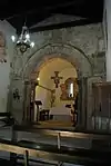 En el interior, el arco triunfal está compuesto por dos arquivoltas de medio punto y guardapolvo con círculos de medio punto. Se apoya en tres columnas a cada lado, con capiteles de decoración vegetal.