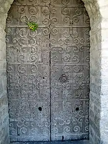 La fachada principal con una gran entrada conserva el herraje original, sobre ella en su centro se encuentra un óculo y dos ventanas estrechas, se remata con una espadaña pequeña de dos huecos.