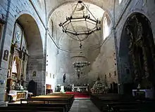 La construcción de la iglesia se remonta al siglo XVI, cuando se levantó sobre otro templo anterior.[1] Hacia 1559 Pedro de Tolosa asumió continuar el proyecto cambiando el tipo de bóveda planeado en principio para el edificio.[2] El trazado de la planta es de tipo basilical de una sola nave de varios tramos con cuatro capillas incorporadas y un ábside ochavado.[2][1] De la fábrica previa a la construcción principal del siglo XVI sólo se conserva una sacristía.[1]