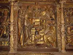 El primer cuerpo está formado por cuatro relieves, dos a cada lado del sagrario. Representan Jesús entre los doctores, Dormición de la Virgen, Matanza de los Inocentes y Huida a Egipto.