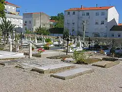 El cementerio rodea la iglesia, dividiéndose así en dos zonas, la norte y la sur. En la parte norte se encuentra el Cristo del Humilladoiro , un crucero del siglo XVI, bajo un baldaquino .[3] La cúpula del baldaquino tiene forma piramidal y tiene dos relevos, uno con las cuatro fases de la luna y otro con una escena de caza en la que un animal herido huye de perros. Castelao lo dibujó en su obra As cruces de pedra na Galiza .