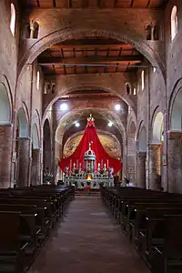 La originalidad recae en los grandes arcos diafragma que atraviesan la nave, aligerados por parejas de bíforas. El alternar entre pilares con arco transversal y pilares simples parece prefigurar el empleo de una cubierta de bóveda, pero en realidad no faltan ejemplos de arcos diafragma sin que una cubierta en el muro estuviera prevista. Los pilares que no sostienen los arcos diafragma son prolongados por lesenas hasta el claristorio, mientras que los arcos longitudinales (los que separan las naves) caen sobre semicolumnas que junto al espesor de la lesena, forman el pilar.