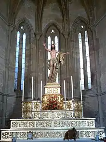 En el presbiterio se encuentra la imagen de Jesucristo Resucitado, realizada por Francisco Buiza Fernández en 1973. A la izquierda se encuentra la imagen de Santa Marina realizada por Ricardo Llamas León y Miguel Ángel Pérez Fernández en 2007. A la derecha se encuentra la imagen de San Juan Bautista de la Salle, realizada por Miguel Ángel Pérez Fernández y Ricardo Llamas León en 2008.[24]