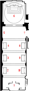 A los lados de la nave se encuentran seis altares de mármol del siglo XVIII, todos idénticos, por encima de los cuales hay un número igual de lienzos. En la pared derecha se encuentra un púlpito marmóreo, por debajo del cual se abre una puerta que conduce a la sacristía, donde hay una pila de agua bendita también de mármol que se remonta al siglo XVI. Desde la sacristía se accede al patio interior del complejo religioso, de donde se despliegan todos los demás ambientes conventuales.