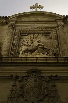 Pero quizás el elemento más representativo de esta iglesia sea su portada lateral, planteada a modo de retablo en dos cuerpos de altura, el inferior con la puerta de entrada flanqueada entre dos pares de columnas jónicas entre las que se enlazan cruces y veneras de Santiago, titular del templo; y el superior, que muestra una gran carga simbólica e iconográfica, centralizado en un gran altorrelieve de Santiago Matamoros, a caballo y vestido de soldado, vencedor sobre un grupo de infieles. Rodeado por un notable marco labrado en piedra y enmarcado entre columnas jónicas de fuste estriado a los que se adosan ángeles, representa el triunfo cristiano sobre la población morisca, mayoría en la zona en el momento de su realización, intencionadamente implantado en la calle de mayor tránsito de la ciudad, en el camino de salida de la Almedina hacia la Puerta Purchena.[2]