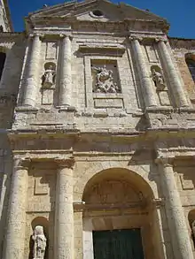 Al exterior se caracteriza por su monumentalidad. La fachada principal, en estilo herreriano, es obra de Diego de Praves. Consta de un cuerpo central dividido en dos pisos mediante una gran cornisa, el piso inferior, con arco de medio punto que cobija una puerta adintelada, rematada en cornisa a modo de dosel, y el superior, repitiendo el mismo esquema con ventana adintelada. Rematando el conjunto, un frontón con una cruz y bolas herrerianas sobre pedestales en los vértices.