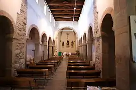 El templo actual tiene planta basilical, un pórtico, dos estrechas naves laterales cubiertas con armadura de madera y una central algo más ancha, separada de aquellas por cuatro arcos de ladrillo semicirculares sobre pilares cuadrados con capiteles-imposta y dos columnas de orden corintio en los dos extremos. Estas se organizan en cuatro tramos. Tres capillas abovedadas, comunicadas con las naves mediante un arco de medio punto, forman la recta cabecera.