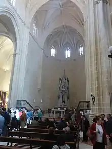 Realizada con planta de salón con ábside saliente, cuenta en su interior con tres naves de desigual altura, la central más alta que las laterales, que al exterior se compensa con los clásicos arbotantes. Carece de crucero y se cubre con bóvedas de crucería sencilla, salvo en el presbiterio y el ábside, que muestran diferentes tramos de nervadura ojival.