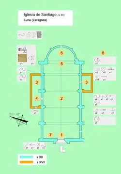 En el siglo XVII, se añadieron dos capillas (3) laterales, la sacristía (4) y coro elevado (7) en el primer tramo.