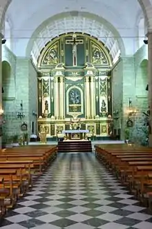Su interior consta de una amplia nave con tramos de arcos fajones, cubierta a principios del siglo XVII por bóvedas de medio cañón, en tanto que el presbiterio se cubre con bóveda de cañón con casetones. Destaca el camarín barroco del Cristo de la Vera Cruz, de base cuadrada, enmarcado por columnas salomónicas, con una gran ventana que lo ilumina, bóveda ochavada y profusa decoración vegetal de frutas complementada con querubines, evangelistas y alegorías de la vida y muerte de Cristo.