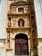 El autor debió seguir el modelo de su trabajo más célebre, la fachada del Colegio Mayor de San Ildefonso de la actual Universidad de Alcalá de Henares. Alojada entre dos contrafuertes, está muy vertical portada se compone de tres cuerpos y un remate en frontón con el busto del Padre Eterno, que verticalmente están recorridos por tres calles, siendo la central cuatro veces más ancha que las laterales. Los cuerpos son entablamientos con friso, sostenidos por pares de columnas de órdenes compuestos. En el cuerpo inferior se abre la puerta de entrada, un arco carpanel. En el segundo cuerpo, la imagen del santo titular, Santiago Peregrino, se yerge en una hornacina avenerada. En las calles laterales de este cuerpo y del inferior, en estrechas hornacinas en los intercolumnios, aparecen los cuatro evangelistas, que junto con el relieve de la Virgen del Pilar que preside del tercer cuerpo son obra del escultor riosecano Juan Canseco, del siglo XVIII. La parte ornamental de esta fachada tan escultórica fue labrada por el entallador palentino Miguel de Espinosa. La decoración en columnas, enjutas, frisos, aletones y acróteras reúne el repertorio habitual del plateresco: grutescos, guerreros recostados, putti, seres fantásticos, medallones, escudos, etc.